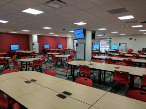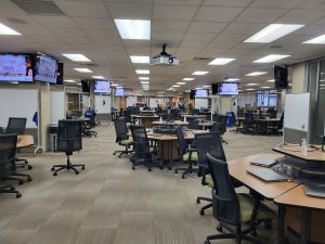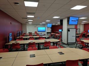Room 410 is a technology enhanced active learning classroom with the capacity to seat 102 people. The room layout consists of 17 round pods/tables seating six individuals, with a CAE laptop at each seat. This room is equipped with audiovisual (AV) capabilities including projection, microphone, and 17 monitors for casting and sharing capabilities between pods. For the following summer 2026, we will add two more tables to 410 and the capacity will be around 112 people. This room can be scheduled for exams by College of Engineering instructors, with priority going to courses currently scheduled in this room. All event requests for this room will be evaluated on a case-by-case basis.
