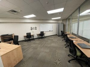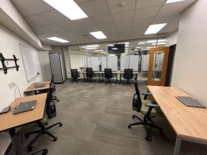 Room 410D is a dedicated computer testing room; it has a capacity of up to 6 individuals, with a CAE laptop at each seat. This space is set up to support accommodated and evening exams. It can be scheduled for exams by College of Engineering instructors, with priority going to courses currently scheduled in the Wendt Commons (fourth floor).